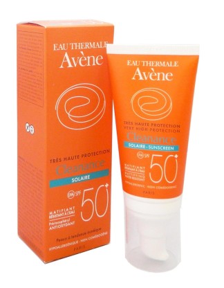 La gamme Cleanance d'AVENE est composée de soin pour les visages à tendance grasse et acnéique pour leur apporter protection, hydratation, netteté et apaisement. Cleanance Solaire SPF50+ d'AVENE non gras, ultra-fluide, et légère, sans paraben, protège la peau soumise à de fortes exposition au soleil et très sensible des rayons UVA/UVB longs et courts (SPF50+), préserve les cellules cutanées du vieillissement prématuré et des rougeurs sur la peau par ses actifs photoprotecteurs pour un minimum de filtres chimiques, ainsi qu'au Pré-tocophéryl qui est le précurseur photostable de la vitamine E. En plus de la protection du soleil, le soin régule la quantité de sébum et diminue l'excès, et matifie la peau grâce à la Monolaurine. L'eau thermale d'AVENE, quant à elle apaise la peau. La peau est douce et bronze facilement, elle est matifiée sans brillance. Résistante à l'eau et à la transpiration.