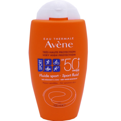 La gamme solaire des produits AVENE, prennent soin des peaux fragiles (sensibles et intolérantes) des petits et grands pour un maximum de protection contre le soleil par un complexe photoprotecteur breveté (SunSitive® protection) et l'eau thermale d'AVENE pour ses propriétés apaisantes. Le Fluide Sport solaire SPF50+ protège la peau sensible, exposée à un fort ensoleillement des rayons UVA/UVB longs et courts (SPF50+), préserve les cellules cutanées du vieillissement prématuré par ses actifs photoprotecteurs pour seulement 4 filtres solaires, ainsi qu'au Pré-tocophéryl qui est le précurseur photostable de la vitamine E et à la Pro-taurine. L'eau thermale d'AVENE, quant à elle apaise la peau. Sa texture ultra-fluide et légère pénètre rapidement à l’application et est très résistante à l'eau et à la sueur. Hypoallergénique
