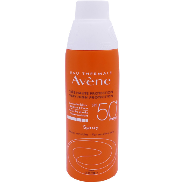 Spray solaire SPF50+ d'AVENE dans votre parapharmacie en ligne à prix discount, la très haute protection solaire des peaux sensibles au soleil exposées à un fort ensoleillement. Visage et corps.