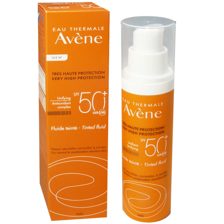 La gamme solaire des produits AVENE, prennent soin des peaux fragiles (sensibles et intolérantes) des petits et grands pour un maximum de protection contre le soleil par un complexe photoprotecteur breveté (SunSitive® protection) et l'eau thermale d'AVENE pour ses propriétés apaisantes. Le Fluide Teinté, non comédogène, protège très efficacement la peau sensible des rayons UVA/UVB longs et courts (SPF50+), préserve les cellules cutanées du vieillissement prématuré par ses actifs photoprotecteurs pour un minimum de filtres chimiques, au complexe Antioxidant associé à la vitamine C qui est le précurseur photostable de la vitamine E antioxydant. L'eau thermale d'AVENE, quant à elle apaise la peau. Sa texture fluide dorée et non grasse pénètre rapidement à l’application pour laisser la peau douce et hydratée et un visage lumineux. Résistante à l'eau et à la transpiration.