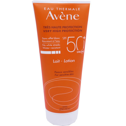 Lait solaire SPF50+ d'AVENE dans votre parapharmacie en ligne à prix discount, la très haute protection solaire des peaux sensibles au soleil, exposées à un fort ensoleillement. Visage et corps.