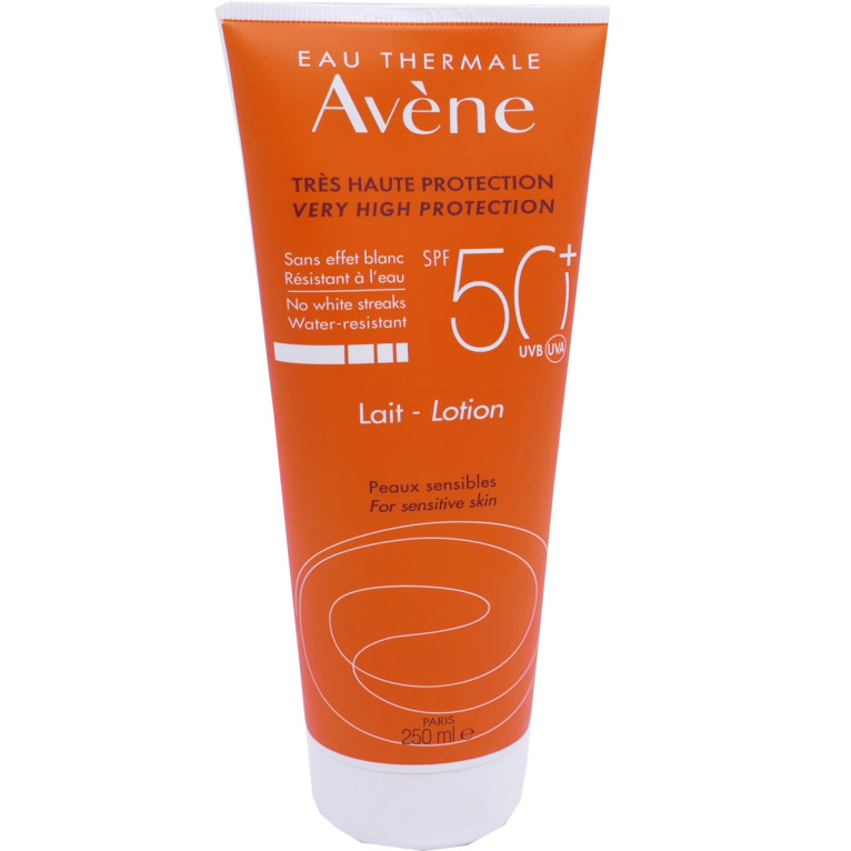 La gamme solaire des produits AVENE, prennent soin des peaux fragiles (sensibles et intolérantes) des petits et grands pour un maximum de protection contre le soleil par un complexe photoprotecteur breveté (SunSitive® protection) et l'eau thermale d'AVENE pour ses propriétés apaisantes. Le Lait solaire SPF50+ protège la peau sensible, exposée à un fort ensoleillement des rayons UVA/UVB longs et courts (SPF50+), préserve les cellules cutanées du vieillissement prématuré par ses actifs photoprotecteurs pour seulement 4 filtres solaires, ainsi qu'au Pré-tocophéryl qui est le précurseur photostable de la vitamine E et à la thialidine. L'eau thermale d'AVENE, quant à elle apaise la peau. Sa texture hydra-protectrice pénètre rapidement à l’application sans laisser de traces blanches sur la peau et l’hydrate pendant 6 heures pour apporter du confort instantanément et durablement. Résistante à l'eau et à la transpiration. Hypoallergénique
