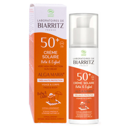 Crème Solaire SPF50+ Bébé Enfant ALGA MARIS à prix discount de LABORATOIRES DE BIARRITZ, la cosmétique française naturelle et bio dans votre parapharmacie en ligne, pour un soin très haute protection solaire pour protéger les peaux fragiles et sensibles des bébés et des enfants (à partir de 6 mois) Visage et Corps