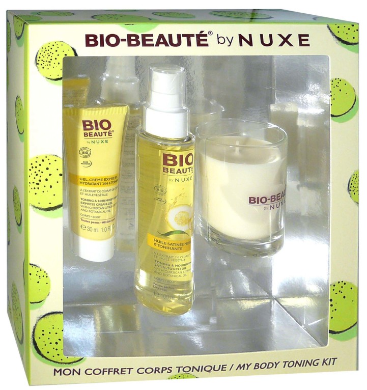 Gel crème express : le gel hydrate intensément et tonifie toutes les peaux du corps pendant 24 heures, lisse la peau, et la tonifie grâce à l’extrait de Cédrat de Corse ainsi qu’à l’Huile végétale de macadamia bio. Sa texture non grasse pour s’habiller rapidement, et onctueuse fond sur la peau pour laisser un parfum tonique et vitaminé. La peau est fraîche et lisse, et retrouve de la vitalité. Huile satinée tonifiante : Elle nourrit, hydrate intensément et tonifie les peaux sèches du corps et la tonifie grâce à l’extrait de Cédrat de Corse ainsi qu’à l’Huile végétale de sésame bio. Sa texture huile non grasse pénètre rapidement la peau pour la laisser douce et satinée. Bougie : Cette bougie à la fragrance tonifiante mythique des agrumes de BIO BEAUTE de NUXE parfumera pour longtemps la pièce pour une ambiance énergique pleine de vitalité.