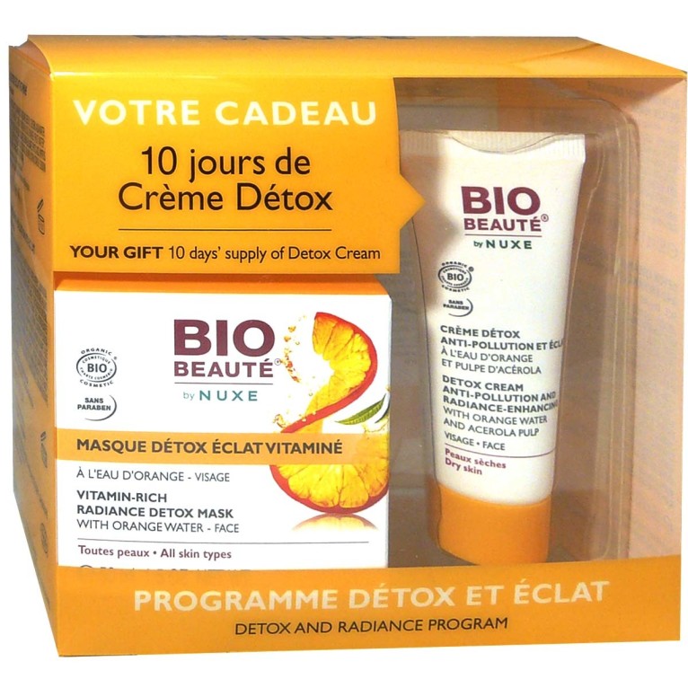 Le Programme « Détox et Eclat » Bio Beauté de NUXE discount, 2 soins réunis dans un coffret dans votre parapharmacie en ligne à prix discount, pour offrir aux peaux fatiguées du visage de l’éclat : Masque Détox éclat vitaminé (50ml) et Crème Détox anti-pollution et éclat (15ml) OFFERTE.