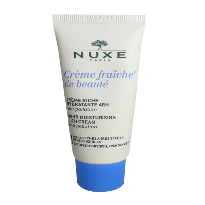 Nuxe, contraction de Nature et Luxe, développe depuis 25 ans des soins cosmétiques raffinés, élaborés avec des actifs végétaux précieux, sans huile minérale ni matière animale hormis les produits de la ruche, pour offrir des produits associant avec le plus bel équilibre : nature, performance et sensualité. La gamme Crème fraîche de Beauté propose des soins au lait végétal pour assurer une hydratation intense pendant 24 heures aux peaux assoiffées. La Crème riche hydratante Crème fraîche de beauté, formulé avec 93,3% d’ingrédients d’origine naturelle dont des laits végétaux et un extrait d’Algue High-tech, est spécialement conçu pour protéger la peau des agressions quotidiennes et de la pollution hydrater intensément et maintenir un taux d’hydratation optimal pendant 48 heures. Elle contient également du beurre de karité bio associé au moringa pour nourrir la peau et la réconfortée. Sa texture cocon qui fond et enveloppe la peau, la laisse fraîche dès l’application. La peau retrouve souplesse et confort instantanément, elle s’enveloppe d’un délicat parfum de fleurs d’oranger, de cèdre et d’amandier. Sans paraben, hypoallergénique.