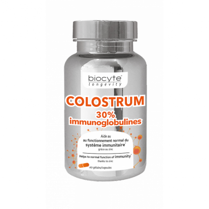 La gamme de BIOCYTE à base d'ingrédients naturels et de technologies de micro-encapsulation répondent rapidement à tous les besoins du quotidien (anti-âge, énergie). Colostrum est un complément alimentaire sous forme de gélules, composé de colostrum issu du premier lait, riche en immunoglobulines (anticorps fabriqués par les lymphocytes B). Le zinc participe au fonctionnement normal du système immunitaire.