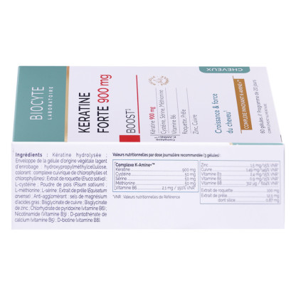 .Ce complément alimentaire de la gamme Biocyte associe un complexe K-AMINE+™ à base d’hydrolysat de kératine soluble, ainsi que des acides aminés tels que la cystéine, la sérine et la méthionine, qui sont des éléments clés dans la composition de la kératine. La prêle contribue à la croissance des cheveux et soutient leur renforcement, tandis que la roquette participe à la stimulation du bulbe capillaire, aidant ainsi à la pousse des cheveux. De plus, les vitamines et minéraux, notamment le zinc et la vitamine B8, soutiennent la synthèse normale de la cystéine, un composant essentiel de la kératine.