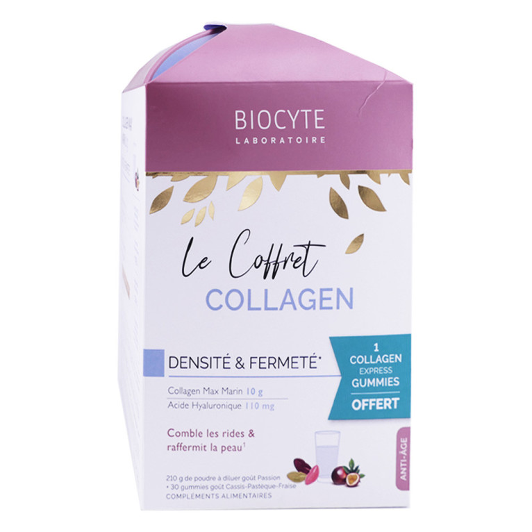 Le Coffret COLLAGEN discount de BIOCYTE, 2 compléments alimentaires à base de collagène pour un programme anti-âge densité et fermeté de 30 jours : Collagen Express Anti-Age Gummies et Collagen Max Marin. Dans votre parapharmacie en ligne à prix discount.