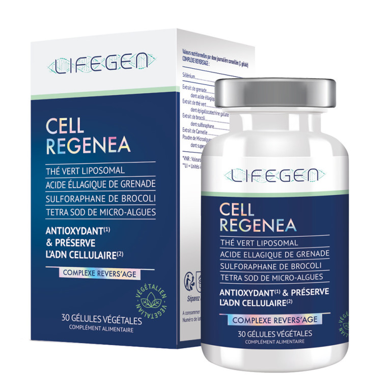Cell Regenea LIFEGEN est un complément alimentaire sous forme de gélules à base d’un complexe unique : REVERS’AGE composé de cannelle sélénium, thé vert, extraits de plantes, microalgues et sélénium. L’extrait de cannelle associé au sélénium contenus dans ce complément alimentaire contribuent à protéger les cellules contre le stress oxydatif, tandis que le thé vert contribue à un vieillissement normal en maintenant l’ADN cellulaire intact.