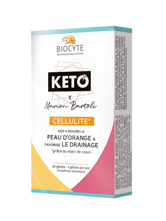 KETO Cellulite est un complément alimentaire conditionné en gélules à base de marc de raisin, pépins de raisin, vigne rouge, pissenlit et caféine. Le marc de raisin aide à réduire la cellulite, l’aspect peau d’orange et favorise le drainage et l’amincissement. Les pépins de raisin favorisent la circulation veineuse. La vigne rouge contribue à améliorer l’apparence de la peau. Le pissenlit favorise le fonctionnement hépatique. La caféine complète la formule. Jour après jour, la peau d’orange diminue, la cellulite se réduit et la circulation s’améliore.