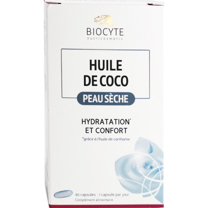 HUILE DE COCO Peau Sèche discount des laboratoires BIOCYTE, un complément alimentaire en capsules composé d’huiles de coco et carthame destiné aux personnes souhaitant apporter de l’intérieur confort et hydratation aux peaux sèches, dans votre parapharmacie en ligne à prix discount.