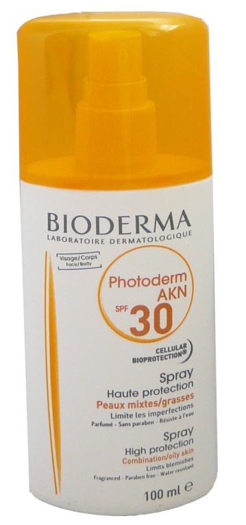 Les produits Photoderm de BIODERMA sont des produits protecteurs de la peau des rayons du soleil et autobronzants adaptés à toute la famille avec différents indices de protection par sa formule essentiellement composée d’un brevet exclusif bioderma Bioprotection® cellulaire. Le spray AKN à la haute protection (SPF30) est composé du complexe sébo-régulateur Fluidactiv (brevet BIODERMA), de systèmes filtrants et de la Biporotection cellulaire (brevet BIODERMA), pour protéger des rayons UVA/UVB longs et courts à large spectre, préserver les cellules de l’épiderme du vieillissement prématuré, et réguler dès l’application la quantité de sébum en excès pour limiter l’effet de brillance sur la peau et l’apparition de nouvelles imperfections. Sa texture ultra légère et non grasse résistante à l’eau laisse la peau douce dès l’application et délicatement parfumée.