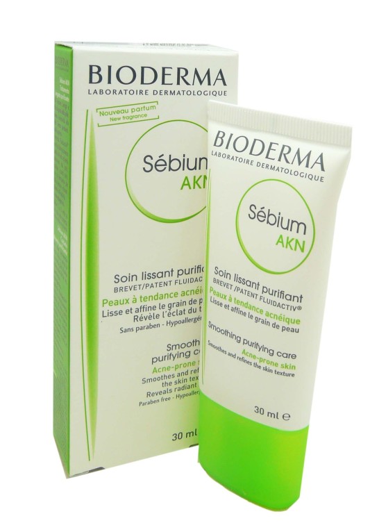 La gamme Sébium de BIODERMA est composée de produits spécifiques pour les peaux grasses à imperfections du corps ou du visage formulés par un complexe breveté Bioderma Fluidactiv® pour retrouver une peau sans défauts. Sébium AKN de BIODERMA est un soin composé du complexe Fluidactiv (brevet BIODERMA), de gluconate de zinc, et d’actifs dermatologiques kératolytiques (esters d’AHA et acide salicylique), pour éliminer le sébum excès de l'épiderme en resserrant les pores tout en le régulant pour lutter contre la réapparition de l'acné (comédons, boutons noirs,…), lisse le grain de peau pour lui redonner de la douceur, hydrate intensément pour lui redonner son confort et redonner au teint tout son éclat. Sa texture légère est non grasse et non collante pour une absorption rapide à l’application. Après le soin la peau est nette, purifiée et le teint lumineux.