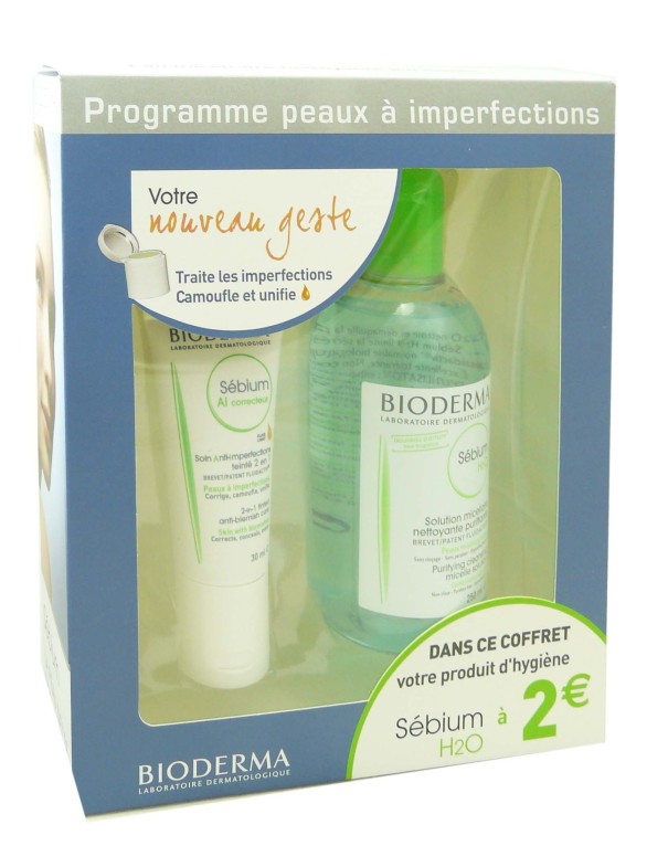 Le coffret SEBIUM de BIODERMA est composé d'un soin teinté AI correcteur 2 en 1 (30ml) et d'une solution micellaire H2O (250ml) à 2€, pour prendre soin des peaux grasses à imperfections.