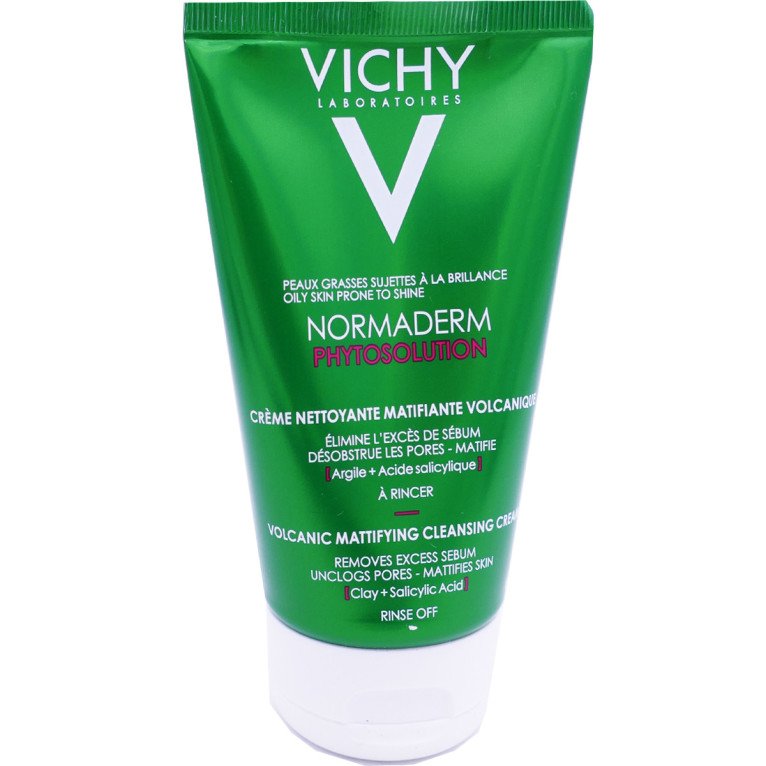 L’Eau Thermale de VICHY puise ses multiples bienfaits au cœur des volcans d’Auvergne. Formulée par la nature, non reproductible, riche en minéraux, cette eau unique offre ses innombrables vertus à la peau. Les laboratoires VICHY ont intégré les vertus thérapeutiques de cette eau précieuse dans leurs produits cosmétiques et propose depuis plus d’un siècle, des routines de soin adaptées à chaque type de peau. La gamme Normaderm de VICHY est composée de soins anti-imperfections (nettoyage, maquillage, soins). Phytosolution Normaderm Crème Nettoyante Matifiante est un soin spécialement conçu pour les peaux grasses sujettes à la brillance. Sa formule à base d’argile, de perlites volcaniques et d’acide salicylique associé à une texture argile qui se transforme en une fine mousse au contact de l'eau va permettre de nettoyer la peau en profondeur et va éliminer l’excès de sébum, désobstruer les pores et matifier la peau durablement.