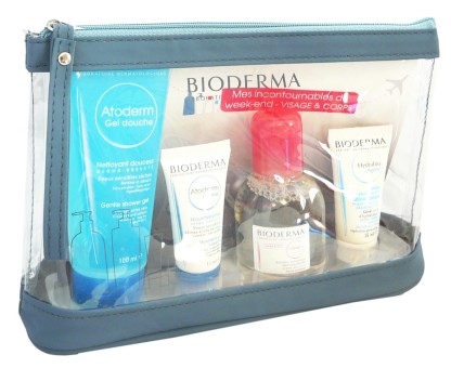 La trousse « Mes inconournalbles » de BIODERMA, une trousse pratique à emporter en déplacement pour prendre soin de soi avec 4 produits essentiels pour le visage et le corps : 1 gel douche nettoyant douceur Atoderm (100ml), 1 crème nourrissante Atoderm (15ml), 1 solution micellaire H2O Créaline (100ml), 1 crème légère Hydrabio (15ml).