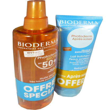2 produits BIODERMA Photoderm dans votre parapharmacie en ligne à prix discount, pour protéger et hydrater la peau avant et après l’exposition au soleil pour peaux très claires et intolérantes au soleil exposés à tous types d’ensoleillement même les plus sensibles : Photoderm Bronz Huile sèche SPF50+ (200ml) + Photoderm Après-soleil Lait fraîcheur offert (100ml). Visage, cheveux et corps