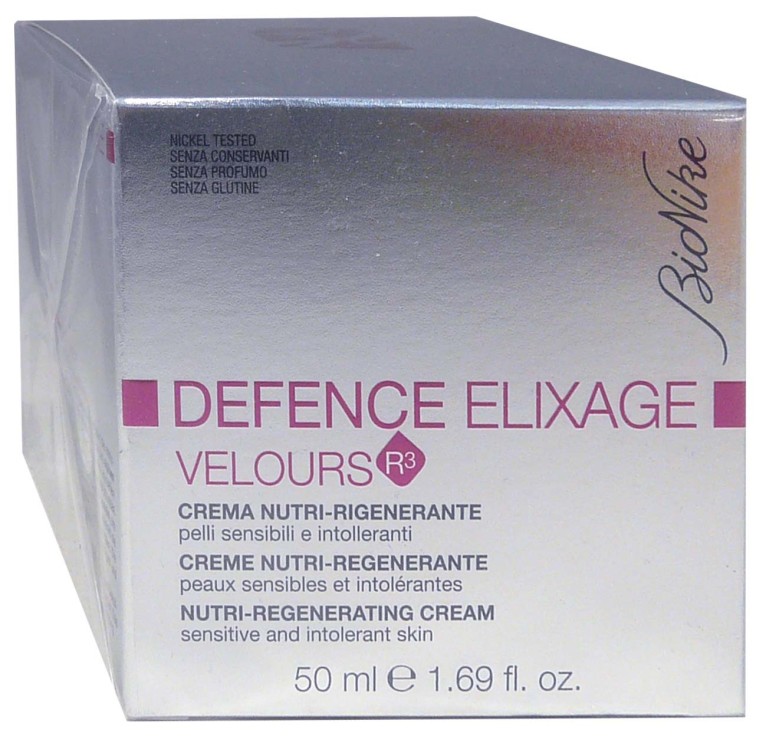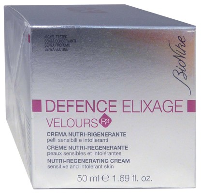 La gamme Defence Elixage propose des soins régénérants adaptés aux peaux les plus intolérantes. La crème Velours R3 Defence Elixage, à la texture riche et veloutée, est un soin anti-âge conçu pour réparer, redensifier et renouveler l’épiderme. Composée d’une formule exclusive (extrait d'algue des neiges alpines, GGP, vitamines F.A.C.E., lycopène et lipides végétaux), cette crème active les mécanismes dynamiques de jeunesse cellulaire et protège la peau du stress oxydatif. Résultat : la peau est plus ferme, plus lisse, réconfortée, le teint est lumineux, le visage gagne en jeunesse. Nickel Tested, sans conservateur, sans gluten, sans parfum.