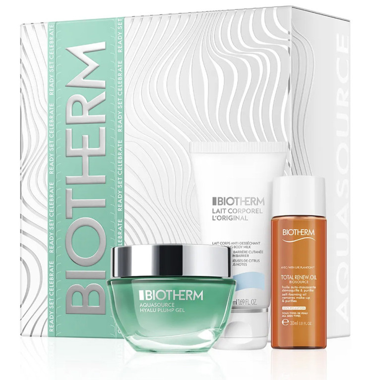 Ce coffret de la marque Biotherm contient trois produits aux textures variées, chacun conçu pour répondre aux besoins spécifiques de votre peau. Le Aquasource Hyalu Plump Gel 50 ml est un gel hydratant qui utilise l'acide hyaluronique et le Plancton de Vie™ pour maintenir l'hydratation de la peau. Le Lait Corporel L'Original 50 ml est une émulsion légère qui adoucit et nourrit la peau grâce à ses propriétés hydratantes. L'Huile Total Renew Oil 30 ml est une huile nettoyante qui dissout les impuretés tout en préservant l'hydratation naturelle de la peau.