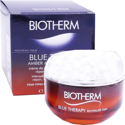 La gamme Blue therapy des laboratoires BIOTHERM est composée de soins anti-âge pour lutter contre les taches cutanées et les rides par sa formule composée essentiellement d’extraits actifs aquatiques. La Crème de Jour Amber Algae Blue therapy est un soin anti-âge innovant pour agir sur la protection de la peau et l’éclat du visage des femmes âgées de 50 ans et plus. Elle répare la peau et la tonifie afin de lutter contre les effets du temps protège des agressions quotidiennes et de l’apparition de rides et ridules, nourrit et revitalise la peau pour préserver sa jeunesse et redonner de l’éclat. Sa nouvelle formule est composée d’une algue ambrée Laminaria Euchroleuca aux propriétés anti-âge puissantes, ainsi qu’au calcium, à un omplexe d’actifs naturels, de 5 huiles végétales (riche en acides gras), et au Life Plancton apaisant et protecteur. Sa texture fondante et illuminatrice avec des micro-perles rosées inspirée de la technologie coréenne, laisse sur la peau un fini velouté pour l’envelopper de douceur et procurer un effet illuminateur. Dès l’application, la peau est douce, lisse et retrouve son éclat. Jour après jour, la peau est protégée et sublimée.