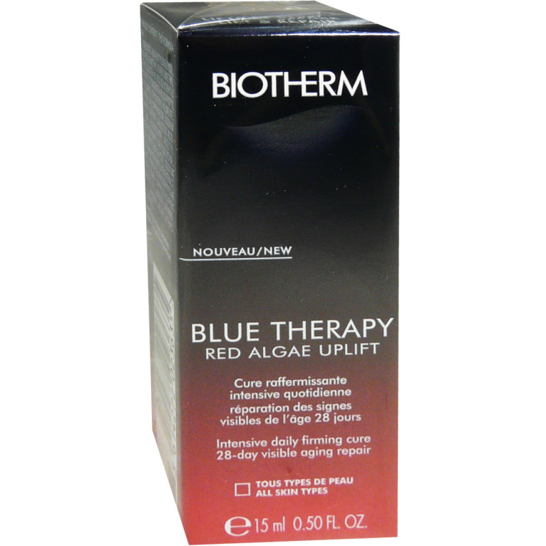 La gamme Blue therapy des laboratoires BIOTHERM est composée de soins anti-âge pour lutter contre les taches cutanées et les rides par sa formule composée essentiellement d’extraits actifs aquatiques. Le Soin Red Algae Uplift Blue therapy est un soin anti-âge intensif innovant à utiliser pendant 28 jours pour des résultats efficaces sur la fermeté de la peau et les contours du visage. Il répare la peau en neutralisant l’inflammaging afin de lutter contre les effets du temps en éliminant les protéines abîmées, accélère le métabolisme cellulaire, raffermit les contours du visage, estompe rides, ridules et agit sur la structure de la peau pour préserver sa jeunesse et redonner de la fermeté. Sa nouvelle formule est composée d’une algue rouge l’Uplifiting Red Algae dont ses composants sont similaires à la matrice de la peau, ainsi que d’une algue de Jeunesse (Alaria Esculenta) qui vient des eaux glacées du Groenland riche en fibres élastiques, protéines et polysaccharides, et au plancton thermale de Vie apaisant et protecteur. Sa texture micro-émulsion liquide et légere laisse la peau fraîche et confortable. Dès l’application, la peau est douce et retrouve sa fermeté avec un effet tenseur. En 28 jours, les rides et ridules s’estompent pour laisser la peau éclatante et jeune.