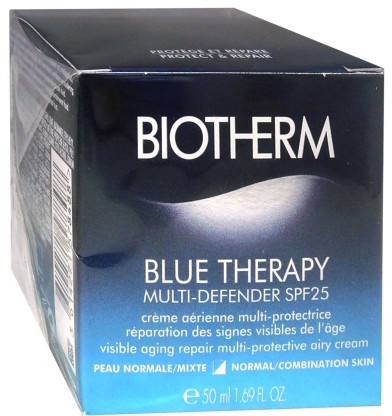 La gamme Blue therapy des laboratoires BIOTHERM est composée de soins anti-âge pour lutter contre les taches cutanées et les rides par sa formule composée essentiellement d’extraits actifs aquatiques. La Crème Blue therapy Multi-Defender SPF25 répare, raffermit et estompe rides, ridules et taches cutanées grâce à une nouvelle formule à base du complexe Broad Outdoor Defense composé de baïcaline aux vertus antioxydantes, ainsi qu’à l’algue de jeunesse et au F. Lumbricalis (algue rouge). Elle va protéger la peau des agressions quotidiennes (tel que la pollution) et des rayons du soleil (UVB, UVA longs), pour lutter contre le vieillissement, et régénérer la peau afin d’estomper les rides profondes, les taches et la fermeté. Sa texture aérienne légère se transforme en eau à l’application et laisse la peau fraîche et confortable. Dès l’application, la peau est douce et retrouve toute sa lumière. Les rides et ridules s’estompent, la peau est lisse et retrouve sa fermeté en 2 mois pour laisser la peau éclatante et jeune.