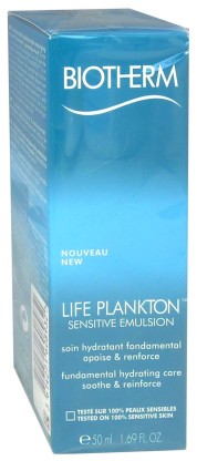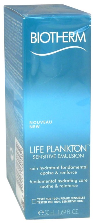 La gamme Life Plankton des laboratoires BIOTHERM est composée de soins réparateurs, protecteurs et ultra-hydratants pour redonner force et beauté à la peau par sa formule composée essentiellement de Plancton de Vie hautement hydratante et régénérante. LIFE PLANKTON Sensitive Emulsion est une émulsion très concentrée en Plancton de Vie (5%) qui est un micro-organisme marin (qui vient des sources thermales des Pyrénées françaises), riche de 35 nutriments. Ses propriétés régénérantes et ultra-hydratantes, vont réparer la peau, la protéger au quotidien des agressions extérieures et l’hydrater intensément en profondeur pour lutter contre la déshydratation pendant 24 heures. Sa texture fluide et crémeuse pénètre rapidement à l’application pour une peau saine et lisse, apaiser de tout inconforts. Le teint uniforme retrouve son éclat. Sans paraben, sans colorants, sans alcool, sans huiles minérales, sans parfums allergènes. Hypoallergénique et non comédogène