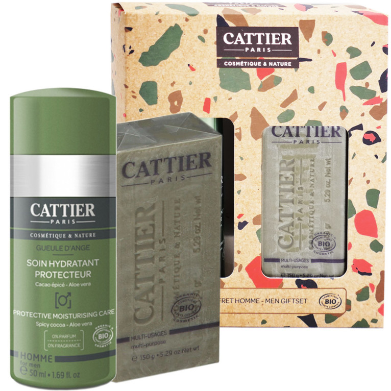Le Coffret Homme de CATTIER, un coffret à offrir ou à se faire offrir, pour des fragrances masculines et un rituel nettoyant et hydratant, composé du : Soin Hydratant Protecteur Gueule d’Ange Bio (50ml) ; Savon Doux Végétal Alargil Bio (150g). Tous types de peaux, grasses et épidermes hyperséborrhéiques ; pour Homme