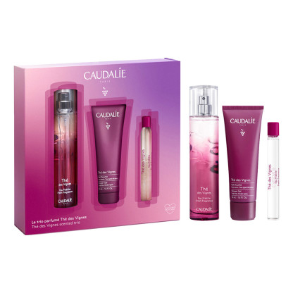 Le Coffret « Trio Parfumé Thé des Vignes » de CAUDALIE, les bienfaits de la vigne pour ces 3 soins parfumés frais et charnels qui transporte au milieu des vignes du Sud de la France, pour le corps : Eau fraîche Thé des vignes (50ml) ; Gel douche Thé des vignes (50ml) offert ; et Eau fraîche Thé des vignes Roll-on en format nomade (10ml) offert. Edition Limitée
