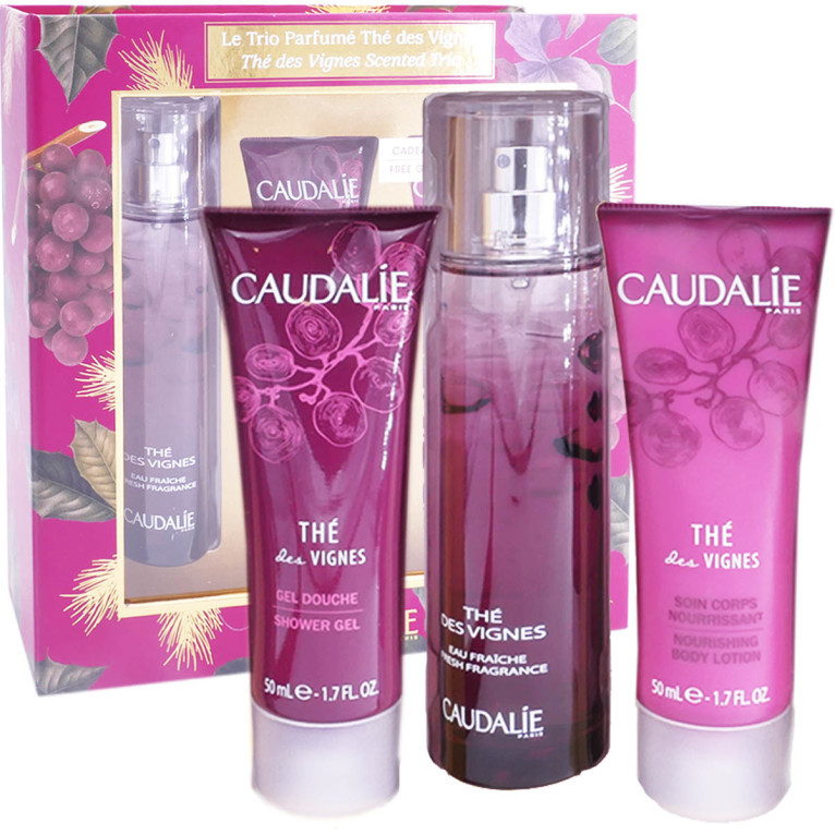 Le Coffret « Parfumé Thé des Vignes » de CAUDALIE, les bienfaits de la vigne pour ces 3 soins parfumés frais et charnelles qui transporte au milieu des vignes du Sud de la France, pour le corps: Eau fraîche Thé des vignes (50ml) ; Soin corps Thé des Vignes (50ml) ; Gel douche Thé des vignes (50ml).