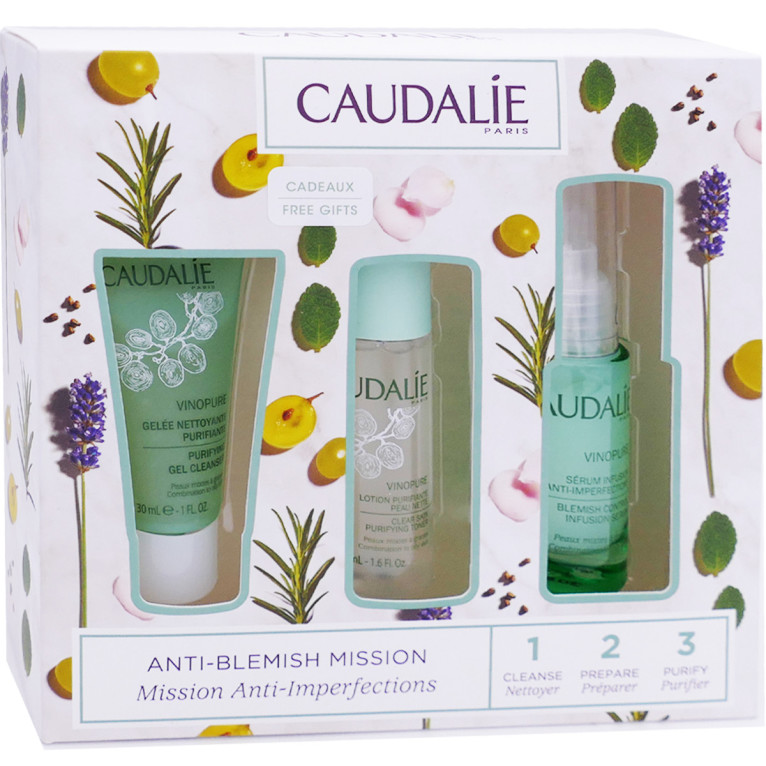 Le coffret VINOPURE « Mission Anti-imperfections » de CAUDALIE discount, 3 soins anti-imperfections réunis dans un coffret, dans votre parapharmacie en ligne à prix discount, pour agir sur les peaux mixtes à grasses à imperfections et leur redonner éclat et douceur : Sérum Infusion Anti-imperfections (30ml) ; Lotion Purifiante (50ml) Offerte ; Gelée Nettoyante Purifiante (30ml) offerte.