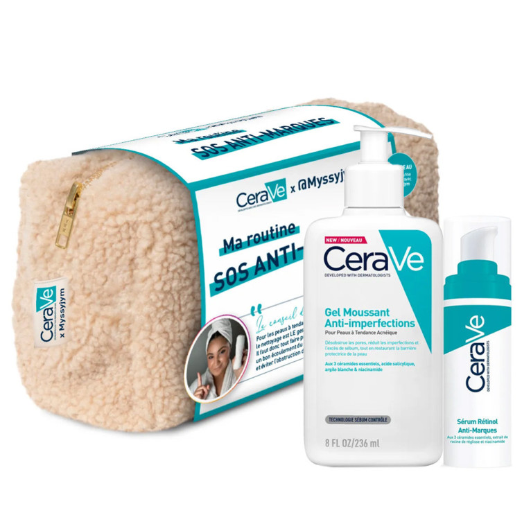 Découvrez la trousse de soins CERAVE ROUTINE SOS ANTI-MARQUES, spécialement conçue pour vous aider à retrouver une peau éclatante et sans imperfections. Cette trousse contient deux produits essentiels pour une routine complète : le Gel Moussant Anti-imperfections (236ml) et le Sérum Rétinol Anti-Marques (30ml).