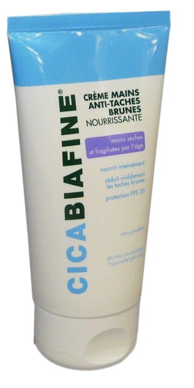 La gamme Cicabiafine du laboratoire BIAFINE propose des soins réparateurs et ultra-hydratants pour les peaux sèches, très sèches et abîmés du visage et du corps. La crème mains anti taches composée de calcium, soja, ; glycérine et d’un indice protecteur FPS20, va protéger du vieillissement cutané en renouvelant les cellules et des rayons UV (FPS20), estomper les taches cutanées et lutte contre leur réapparition, nourrir intensément et hydrater les mains. Sa texture fondante non grasse pénètre rapidement à l’application pour laisser la peau extra-douce. Jour après jour, les taches brunes sur les mains s’estompent pour retrouver une peau uniforme.