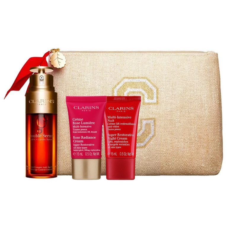 Le Double Serum 50ml est le produit phare de cette gamme, il est composé de 21 extraits de plantes pour une action anti-âge globale. La crème Multi-Intensive Rose Lumière Toutes Peaux 15ml et la crème de nuit Multi-Intensive Toutes Peaux 15ml offertes dans ce coffret sont formulées pour hydrater et nourrir en profondeur votre peau. Les échantillons de Double Serum Eye 0,9ml offerts vous permettront de tester ce produit sur le contour de vos yeux. Enfin, la trousse offerte vous permettra de transporter facilement vos produits de beauté lors de vos déplacements.