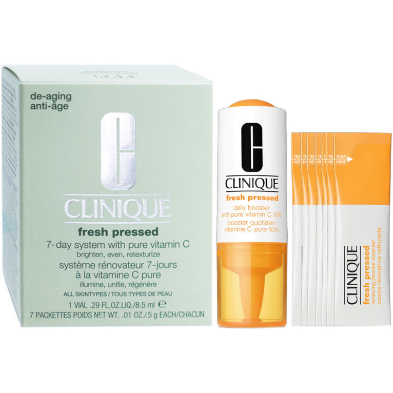 Fresh Pressed Système Rénovateur 7 Jours discount de CLINIQUE, des soins cosmétiques dermo-professionnel dans votre parapharmacie en ligne à prix discount, dans un soin concentré en vitamine C Pure qui agit sur les signes du vieillissement cutané et le teint terne. Tous types de peaux. Visage.