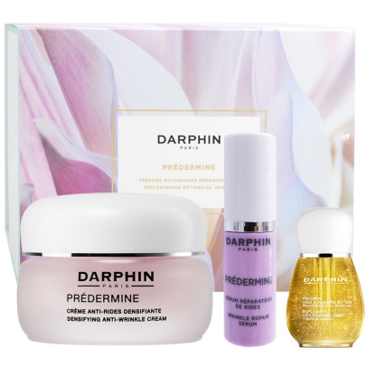 Le coffret PREDERMINE « Trésors Botaniques Redensifiant» discount de DARPHIN, 3 produits regroupés dans un coffret à offrir ou à se faire offrir pour agir sur la fermeté de la peau et lutter contre les signes de l’âge : Prédermine Crème Anti-rides Densifiant (50ml) ; Prédermine Fermeté Réparateur de rides (5ml) offert ; Nectar aux 8 Fleurs et Or (4ml) offert.