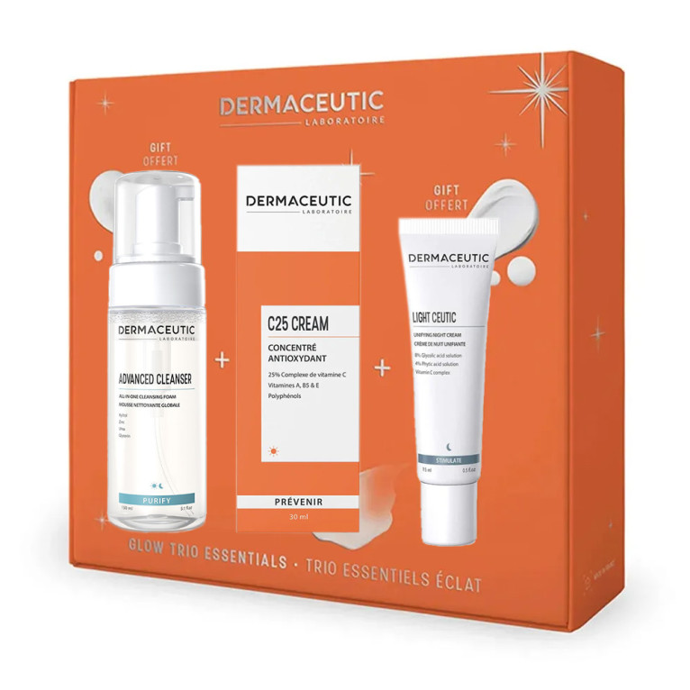 DERMACEUTIC COFFRET TRIO ESSENTIELS ÉCLAT 3 SOINS en vente en ligne sur le site de votre parapharmacie à prix discount, vous offre une routine complète pour un teint éclatant et revitalisé.