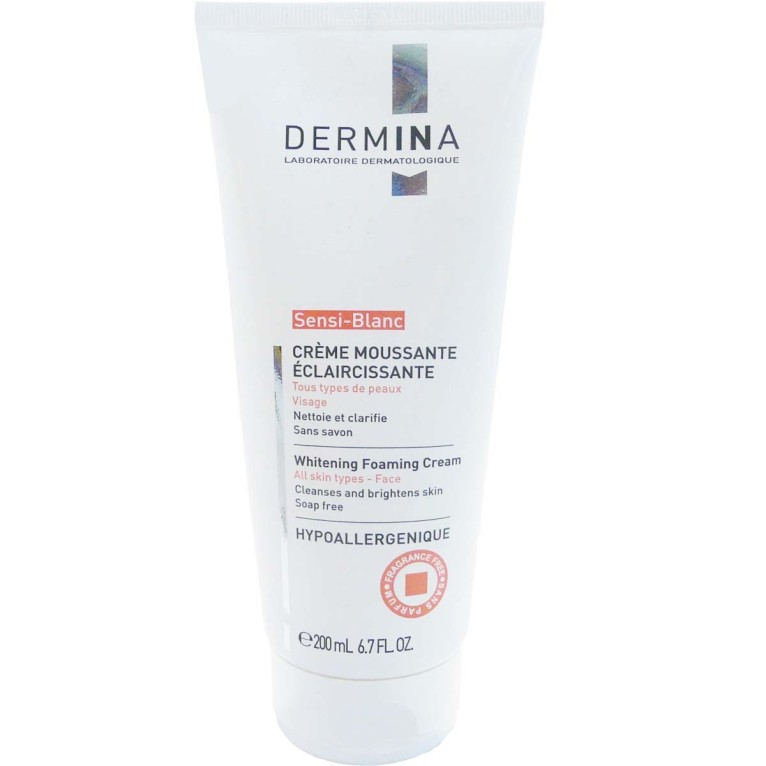 La gamme Sensi-blanc du laboratoire dermatologique DERMINA contient des produits très doux qui viennent aux besoins des peaux sensibles pour protéger, clarifier et apaiser tout en douceur, et redonner de l’éclat au teint. La crème moussante éclaircissante SENSI-BLANC sans savon, est à base d’actifs antioxydants et éclaircissants (vitamine C stabilisée, extrait de licorice) pour nettoyer délicatement la peau en éliminant toutes les impuretés tout en respectant son équilibre, protéger du stress oxydatif, purifier la peau, éclaircir le visage pour retrouver un teint lumineux, et adoucir la peau, dès l’application. Sa texture légère laisse sur la peau une grande douceur après le soin. Dès l’application et pour longtemps, la peau est nette, clarifiée et douce, le teint unifié retrouve sa luminosité. Hypoallergénique. Sans parfum