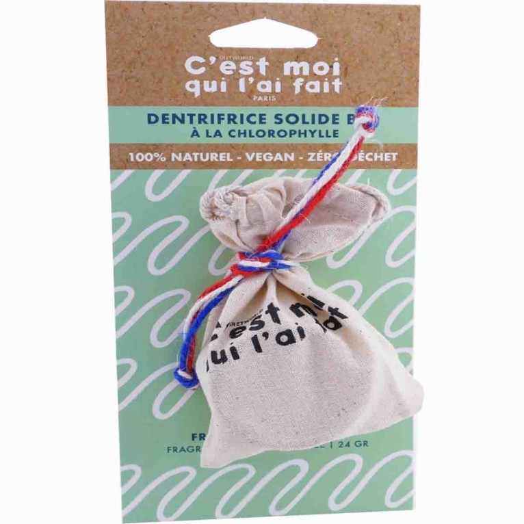 La gamme « C’EST MOI QUI L’AI FAIT » de DIET WORLD est une gamme de fabrication artisanale composée de produits cosmétiques végan et 100% naturel. Testé dermatologiquement, ce dentifrice Solide Bio permet une utilisation de longue durée (semblable à 2 tubes de dentifrice classique). A base d'actifs 100% naturels et vegan (huile essentielle menthe poivrée, carbonate de calcium, xylitol, chlorophylle), les dents seront protégées de l’apparition de caries et l’haleine sera fraîche. Zéro déchet, le carton, le sac en coton, la cordelette et le bâtonnet en bois sont compostables.