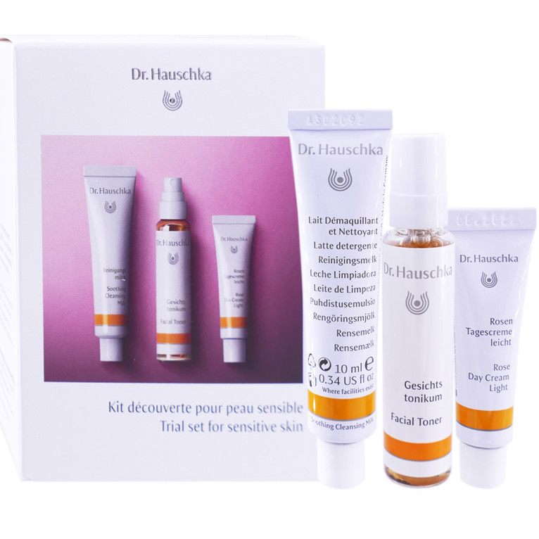 Kit Découverte pour Peaux Sensibles discount de Dr HAUSCHKA, la cosmétique bio et naturelle dans votre parapharmacie en ligne à prix discount, pour un rituel apaisant et protecteur en 3 étapes au quotidien destiné aux peaux très réactives : Lait Démaquillant et Nettoyant 10ml, Lotion Tonifiante pour le Visage 10ml, Crème de Jour Légère à la Rose 5ml. Visage