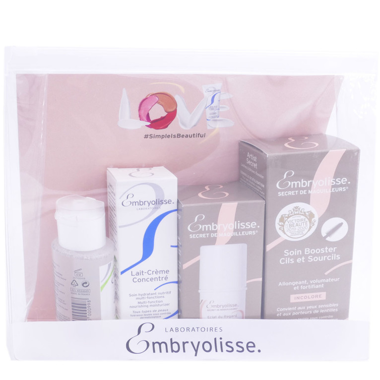 La Trousse Embryolisse discount des laboratoires EMBRYOLISSE, une trousse composée de 4 soins (Lotion Micellaire (50ml); Lait Crème Concentré (15ml); Stick Eclat du regard (4.5g); Soin Booster Concentré (6.5ml)), qui convient à tout les types de peau et également aux plus sensibles pour un maquillage qui redonne un joli teint au visage, dans votre parapharmacie en ligne à prix discount.