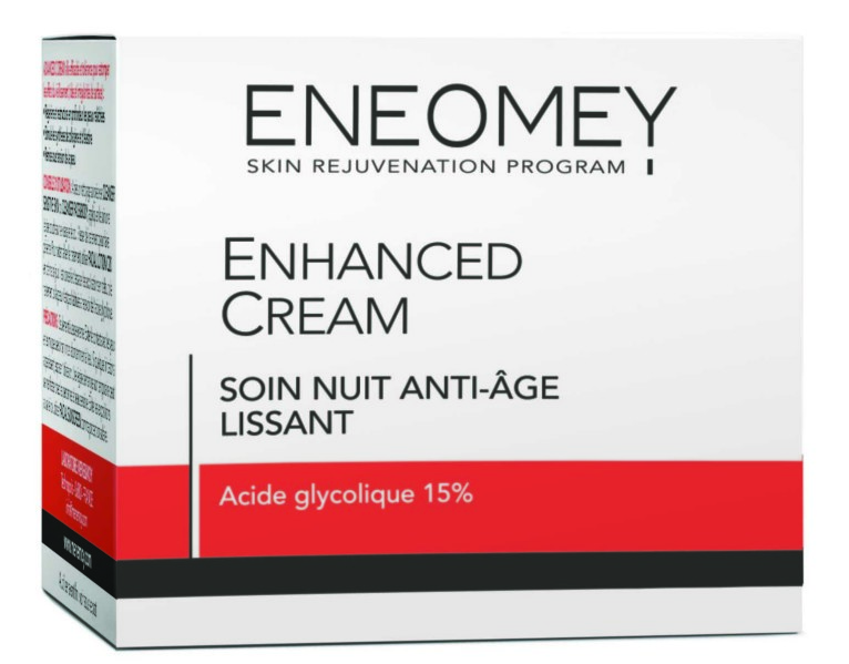 Issus de la cosmétologie dynamique, une alternative non invasive à la chirurgie esthétique, les produits mene&moy ENEOMEY sont composés de principes actifs fortement dosés et redoutablement efficaces sur les désordres cutanés liés au vieillissement cellulaires : la vitamine C stabilisée et l’acide glycolique. Enhanced Cream de mene&moy est un soin concentré en acide glycolique à 15%, spécialement conçu pour assurer une action exfoliante, éliminer les cellules mortes, estomper rides et ridules des peaux normales à mixtes. La peau retrouve souplesse, élasticité, douceur, éclat, le visage parait visiblement plus jeune.