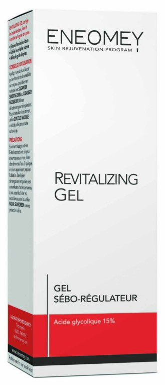 Issus de la cosmétologie dynamique, une alternative non invasive à la chirurgie esthétique, les produits mene&moy ENEOMEY sont composés de principes actifs fortement dosés et redoutablement efficaces sur les désordres cutanés liés au vieillissement cellulaires : la vitamine C stabilisée et l’acide glycolique. Revitalizing Gel de mene&moy ENEOMEY est un soin concentré en acide glycolique dosé à 15%, et en ammonium hydroxyde, spécialement conçu pour exfolier, hydrater et réguler l’excès de sébum des peaux grasses sujettes aux imperfections. Revitalizing Gel stimule la régénération cellulaire et favorise la synthèse de collagène. La peau retrouve tonus, fermeté et le grain de peau est visiblement affiné.