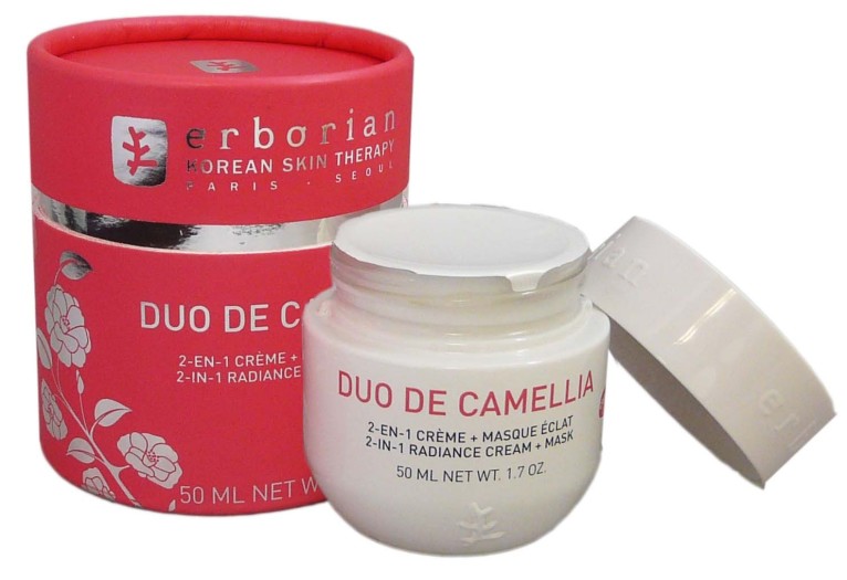 Le laboratoire ERBORIAN conçoit des produits cosmétiques inspirés des traditions coréennes contenant des herbes coréennes pour redonner à la peau de l’éclat. Duo de Camélia 2 en 1 agit comme un soin anti-âge par une crème de jour et/ou comme un masque. Il lisse la peau pour estomper rides et ridules, protège, répare, affine le grain de peau, nourrit, éclaircit et unifie la peau, et redonne de l’éclat grâce à sa richesse en camélia (feuilles et huile) ainsi qu’au pourpier (extrait de plante). Dès la première application, la peau est lisse, éclatante et douce comme de la soie.