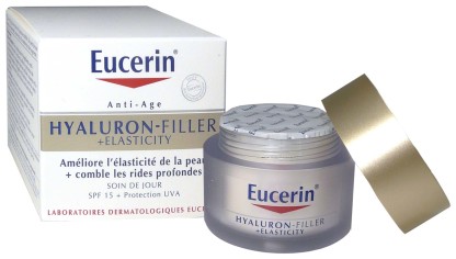 La gamme Hyaluron-Filler+Elasticity du laboratoire EUCERIN est composée de soins anti-âge à base d'arctiine, de silymarine et d'acide hyaluronique pour combler les rides même profondes, raffermir et redonner de l'éclat au visage. La Crème de jour EUCERIN ELASTICITY+FILLER est un soin anti-âge aux propriétés raffermissantes et protectrices. Composée d’arctiine pour accélérer le renouvellement du collagène, silymarine pour protéger le collagène et l’élastine, et d’acide hyaluronique pour combler les rides même profondes, la peau retrouvera fermeté, souplesse, densité, confort et douceur. Elle contient également un indice protecteur SPF15 qui protègera la peau des rayons UVB/UVA du soleil qui sont la cause du vieillissement prématuré. Dès l’application, la peau retrouve sa fraîcheur, le visage retrouve son éclat.