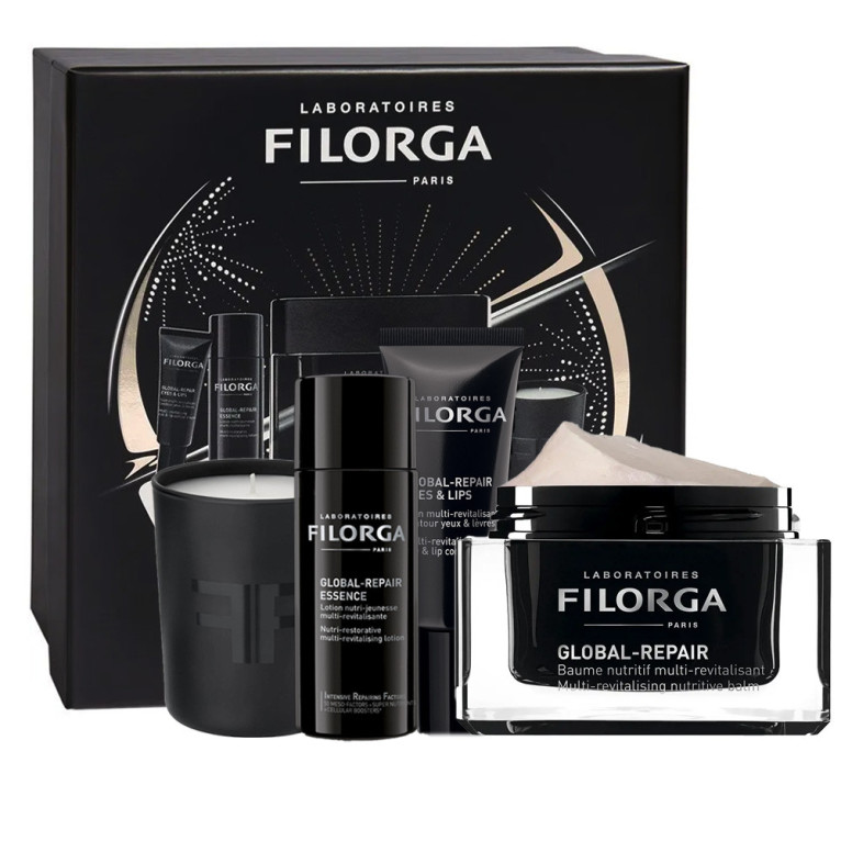 Le Coffret « Global Repair » discount des Laboratoires FILORGA, 3 soins anti-âge revitalisants réunis spécialement conçu pour les peaux dévitalisées dans votre parapharmacie en ligne à prix discount. Visage ; Contour des yeux et des lèvres. Peaux dévitalisées Baume Global-Repair (50ml) ; Sérum Global-Repair Essence (50ml) ; Soin Global-Repair Eyes&Lips (4ml). Avec bougie. Edition 2023