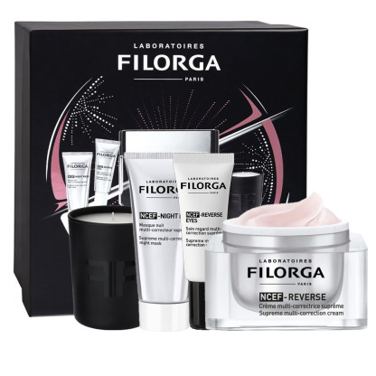 Le coffret « NCEF REVERSE » de FILORGA dans votre parapharmacie en ligne à prix discount, 3 soins pour une routine Anti-rides, inspirés de la médecine esthétique aux vertus anti-âge puissantes essentiels pour réduire les rides et redonner beauté et éclat au visage et au regard : NCEF-Reverse Crème Multi-correctrice Suprême (7ml) ; NCEF-Reverse Eyes Soin regard (4ml) ; NCEF Night-Mask (15ml) Visage, Yeux peaux marquées par l’âge en perte d’éclat. Visage, contour des yeux Avec Bougie. Edition 2023