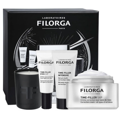 Le Coffret « TIME-FILLER » de FILORGA dans votre parapharmacie en ligne à prix discount, 3 soins inspirés de la médecine esthétique aux vertus anti-âge pour lutter contre les rides, et redonner de l’éclat au visage et au regard : Time Filler Soin de jour 5XP (50ml), Time Filler Eyes 5XP (4 ml), Time Filler Intensive (7ml). Visage et contour des yeux. Avec bougie. Edition 2023