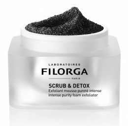FILORGA, fort d’une expérience reconnue dans le traitement du vieillissement cutané depuis plus de 40 ans, a donné naissance à la toute première gamme française de soins cosmétiques inspirés de la médecine esthétique : des soins qui associe efficacité technique et dimension plaisir. SCRUB & DETOX est un masque à l’action double exfoliation et détoxification. A base de micro-sphères volcaniques, de papaïne, polyphénols et charbon actif, le masque va participer à l’élimination des impuretés de l’épiderme pour une action lissante, et réparer les cellules cutanées pour un effet peau neuve immédiat, mais également rendre le teint pur et éclatant en détoxifiant l’épiderme du stress cutané. La peau sera protégée des agressions quotidiennes grâce aux vertus protectrices et apaisantes d’un complexe apaisant (niacinamide, vitamine E). En se transformant en mousse noire veloutée, la peau est hydratée et adoucie pour retrouver son confort. La peau est nette, éclatante, comme neuve en 5 minutes seulement et pour longtemps !